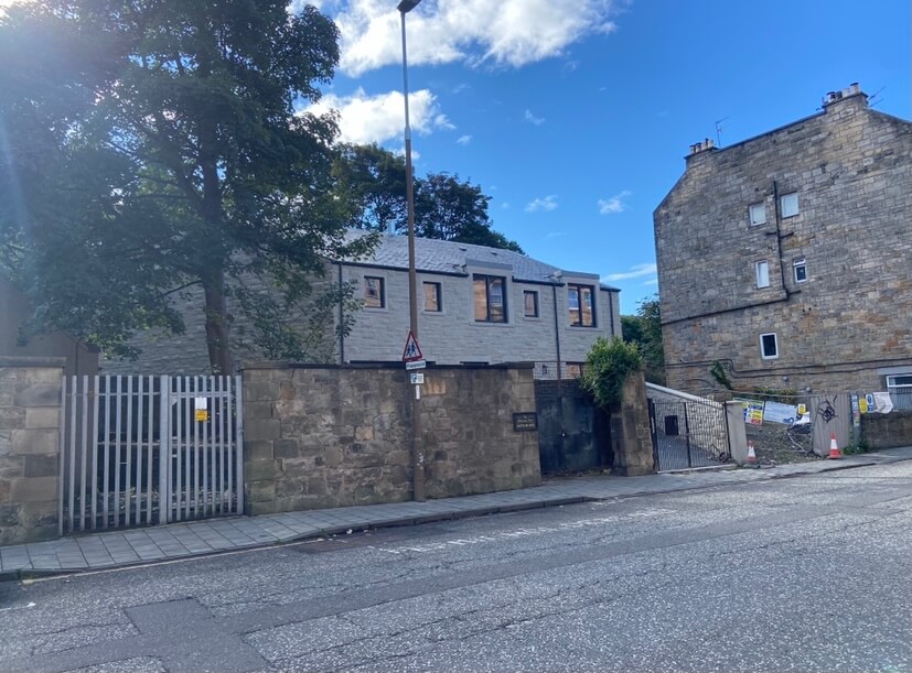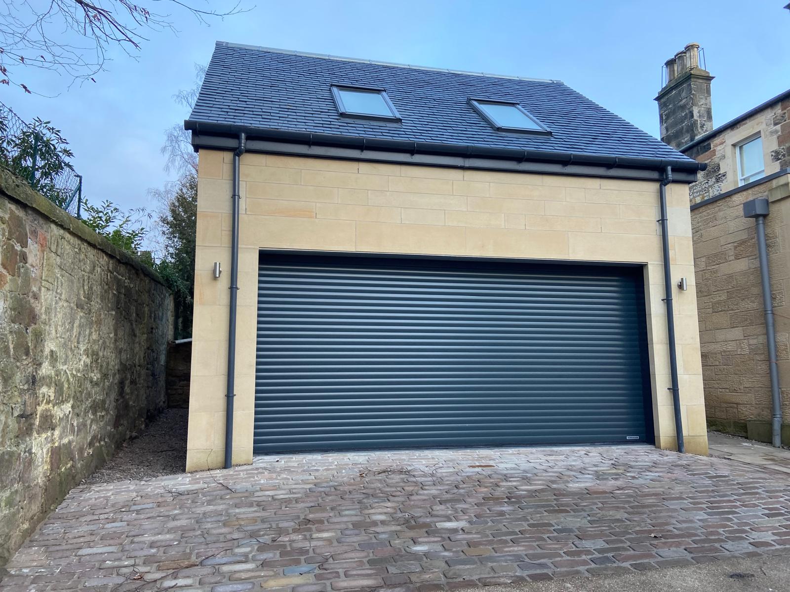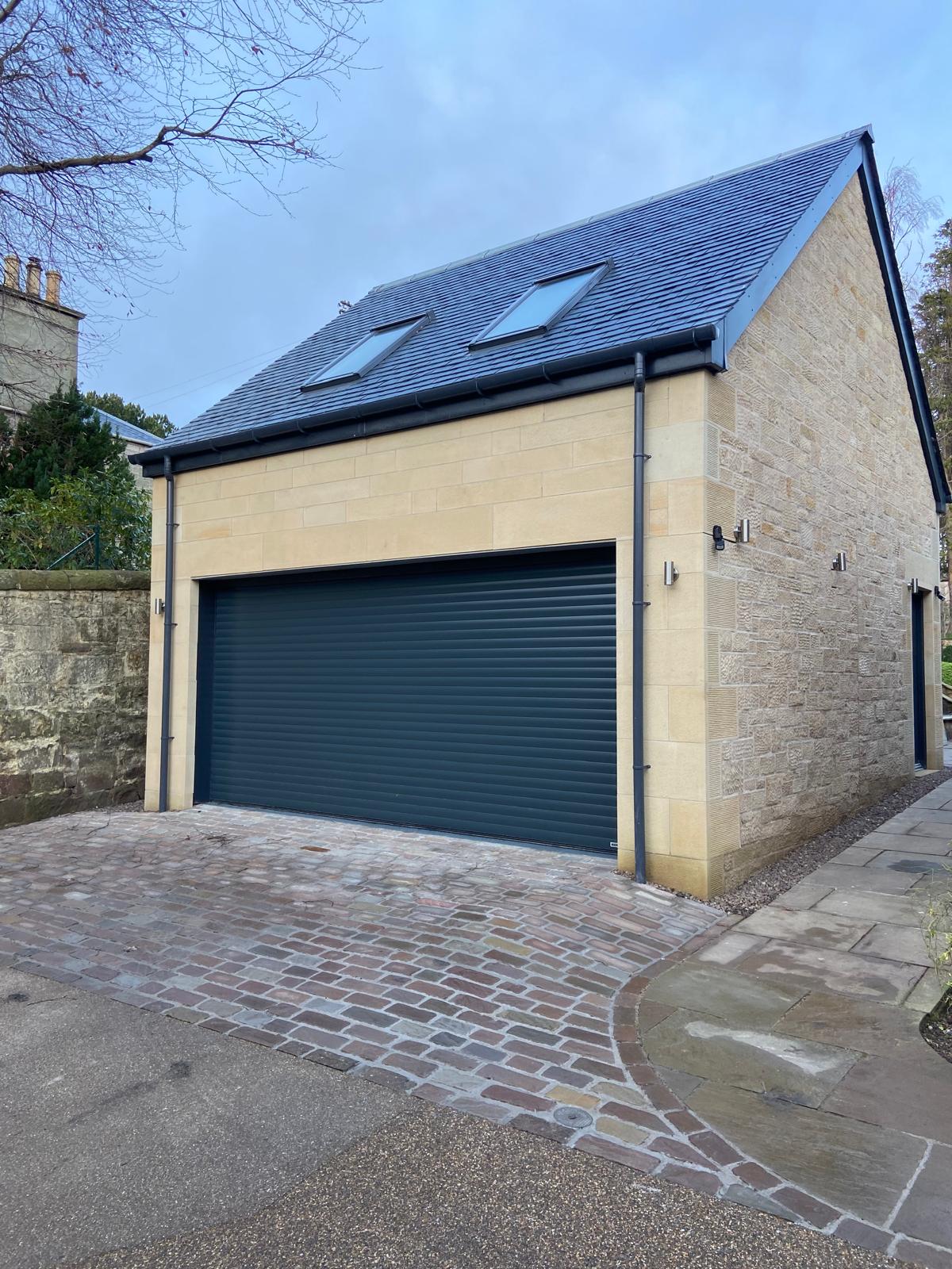 Sheed Stonemasonry constructed this new build garage in Morningside, working closely with our client to achieve a good project all round. Front elevation is sparrow dabbed ashlar and the gables and rear elevation is stugged buff walling along with broached surface finishes returns on the quoins and rybats. Stone type used was Witton Fell.